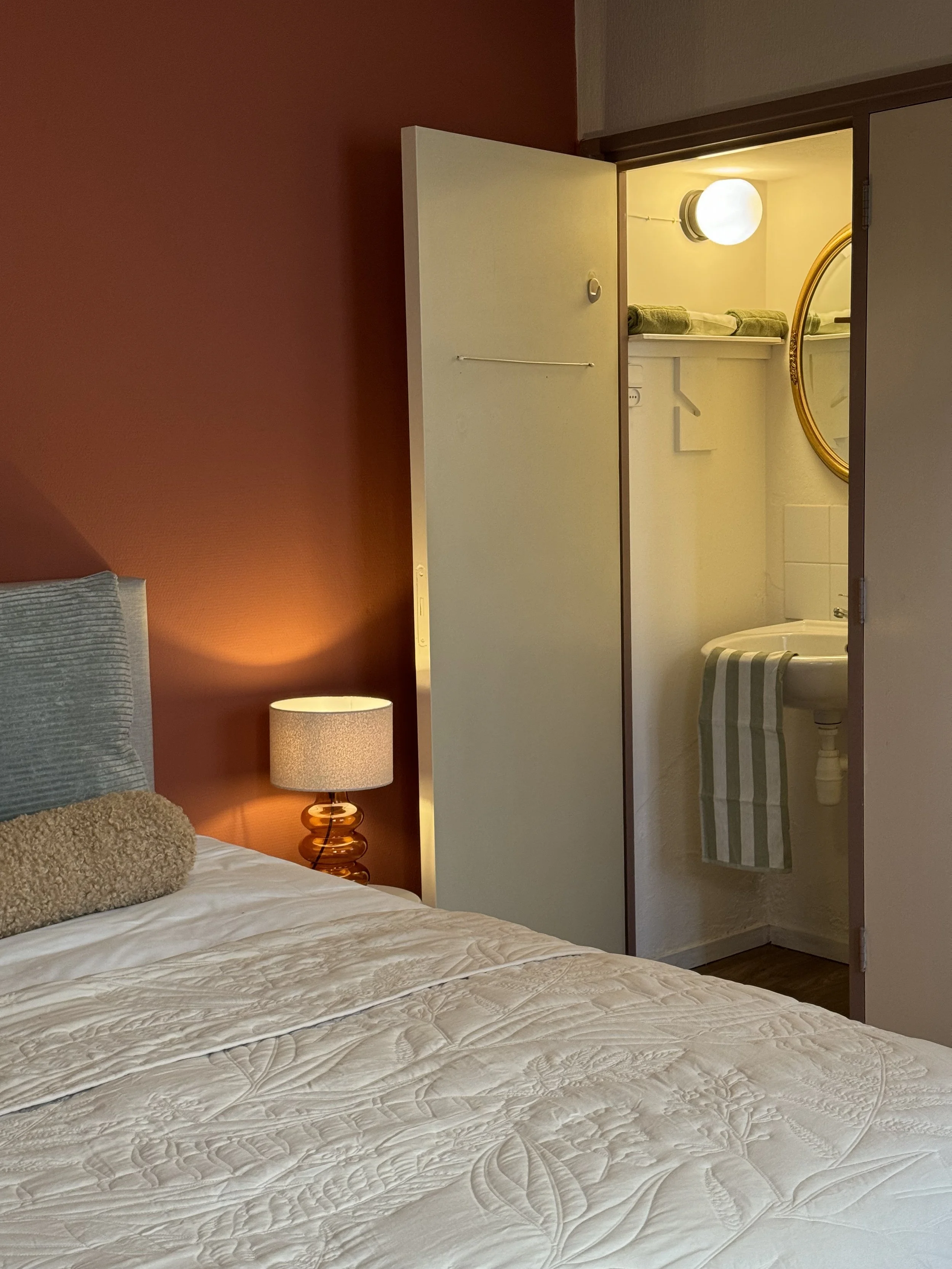 A larger room with a big built-in wardrobe, perfect for keeping things tidy and organized.