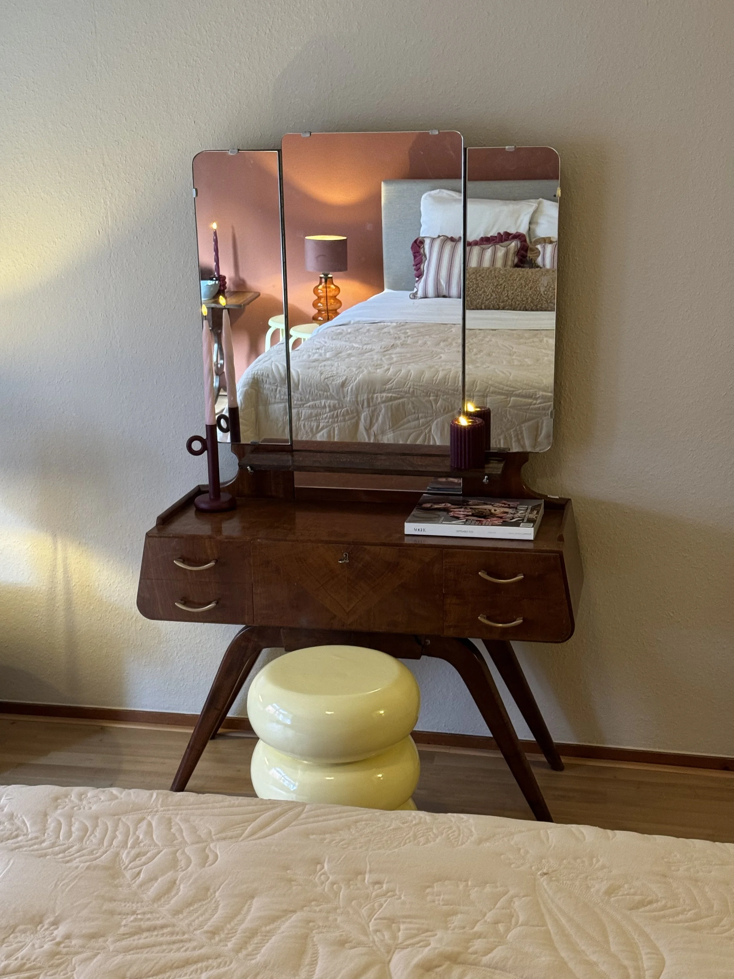 A cozy room with a vintage vanity table, perfect for a bit of old-school charm.